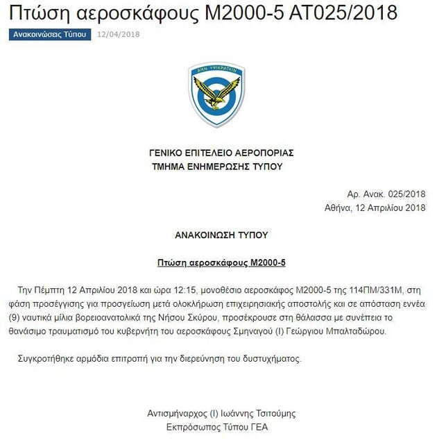 «Την Πέμπτη 12 Απριλίου 2018 και ώρα 12:15, μονοθέσιο αεροσκάφος M2000-5 της 114ΠΜ/331Μ, στη φάση προσέγγισης για προσγείωση μετά ολοκλήρωση επιχειρησιακής αποστολής και σε απόσταση εννέα (9) ναυτικά μίλια βορειοανατολικά της Νήσου Σκύρου, προσέκρουσε στη θάλασσα με συνέπεια το θανάσιμο τραυματισμό του κυβερνήτη του αεροσκάφους Σμηναγού (Ι) Γεώργιου Μπαλταδώρου.