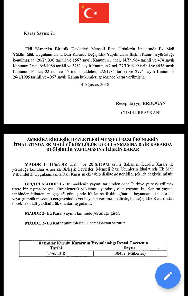 «Η Τουρκία προχώρησε σε αύξηση των τελωνειακών δασμών σε εισαγόμενα αμερικανικά προϊόντα βάσει της αρχής της αμοιβαιότητας, σε αντίποινα στις εσκεμμένες επιθέσεις της αμερικανικής κυβέρνησης στην οικονομία μας», ανέφερε σε σχετική ανάρτησή του στο Twitter ο Τούρκος αντιπρόεδρος Φουάτ Οκτάι.