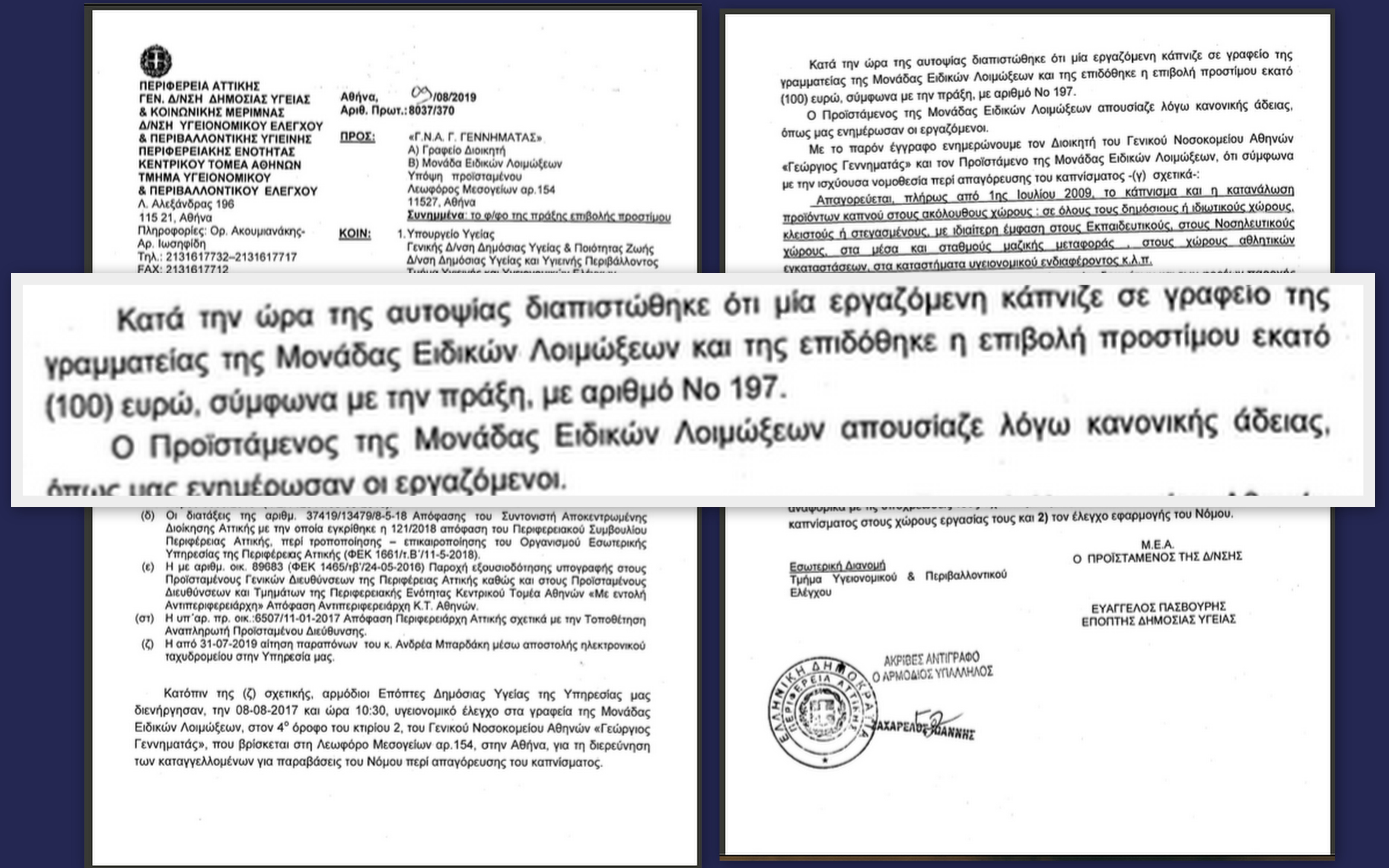 Κατά τη διάρκεια των ελέγχων, λοιπόν, και συγκεκριμένα στις 10:30 το πρωί της 8ης Αυγούστου οι ελεγκτές εντόπισαν εργαζόμενη κάπνιζε σε γραφείο της γραμματείας της Μονάδας Ειδικών Λοιμώξεων.