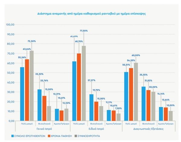 Βάσει του 50% των απαντήσεων των ερωτηθέντων, προκύπτει πως μεσολαβεί μεγάλο χρονικό διάστημα αναμονής ανάμεσα στον καθορισμό της επίσκεψης στον γιατρό από την ημέρα της ιατρικής εξέτασης. Άτομα με συννοσηρότητα αναφέρουν ακόμα μεγαλύτερους χρόνους αναμονής για εξέταση από γενικό, ειδικό γιατρό και διαγνωστικές εξετάσεις.