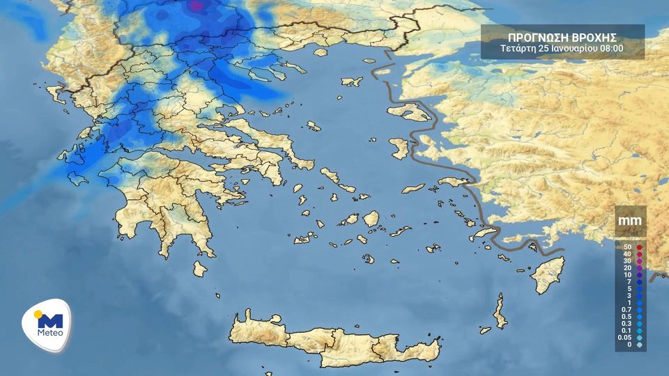 Σήμερα, Τρίτη 24 Ιανουαρίου 2023, βροχές και ενδεχομένως σποραδικές καταιγίδες θα εκδηλωθούν κυρίως στη Δυτική Στερεά, στην Ανατολική Θεσσαλία, στην Κεντρική Μακεδονία και στο Βόρειο-Βορειοδυτικό Αιγαίο, περιοχές όπου τα φαινόμενα θα είναι κατά περιόδους έντονα. Τοπικά έντονα φαινόμενα ενδέχεται να εκδηλωθούν και στις Σποράδες. Στην υπόλοιπη χώρα αναμένονται κατά τόπους αυξημένες νεφώσεις, με τοπικές βροχές στη Δυτική Ελλάδα, στην υπόλοιπη Θεσσαλία, στην Ανατολική Μακεδονία, καθώς επίσης σε περιοχές της Στερεάς, της Εύβοιας και της Πελοποννήσου. Χιονοπτώσεις θα εκδηλωθούν στα κεντρικά και βόρεια ορεινά. Παράλληλα αυξημένες θα είναι οι συγκεντρώσεις σκόνης στα δυτικά, ενώ τη νύχτα και νωρίς το πρωί η ορατότητα στα ηπειρωτικά θα είναι τοπικά περιορισμένη.