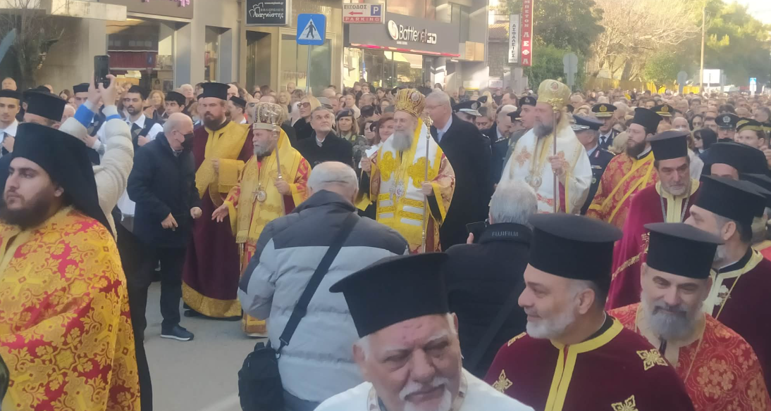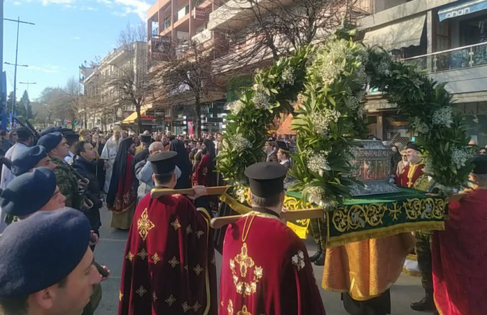 Σήμερα, Σάββατο, ανήμερα της εορτής του Αγίου, από νωρίς το πρωί τελέστηκαν ο Όρθρος και η Θεία Λειτουργία τόσο στον Ιερό Ναό του Αγίου Γεωργίου όσο και στον Σεπτό Οίκο. Ακολούθησε η καθιερωμένη λιτάνευση των Ιερών Λειψάνων στο κέντρο της πόλης, παρουσία πλήθους πιστών και εκπροσώπων των τοπικών αρχών. Η πομπή ολοκληρώθηκε με την εναπόθεση των Λειψάνων στον Μητροπολιτικό Ναό.